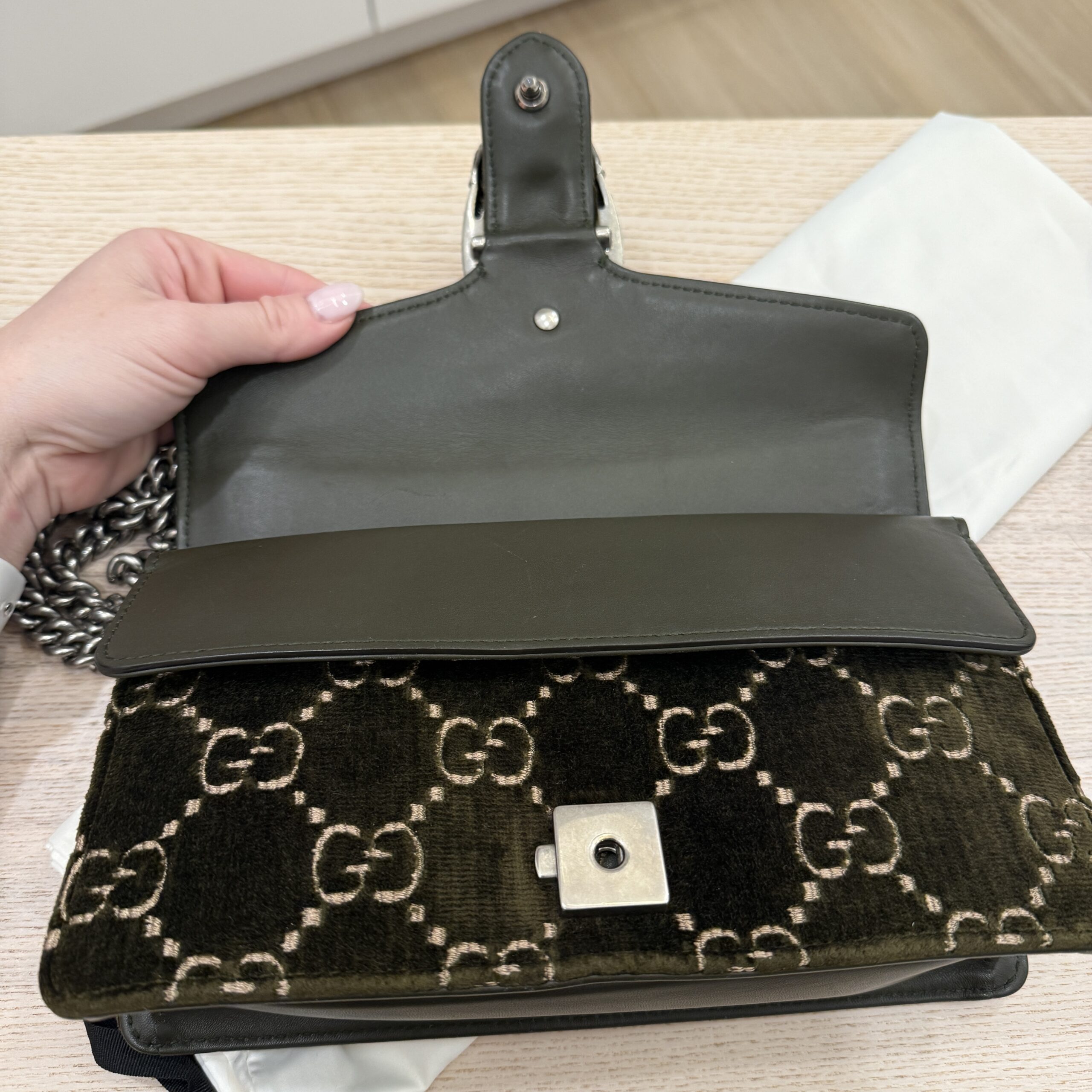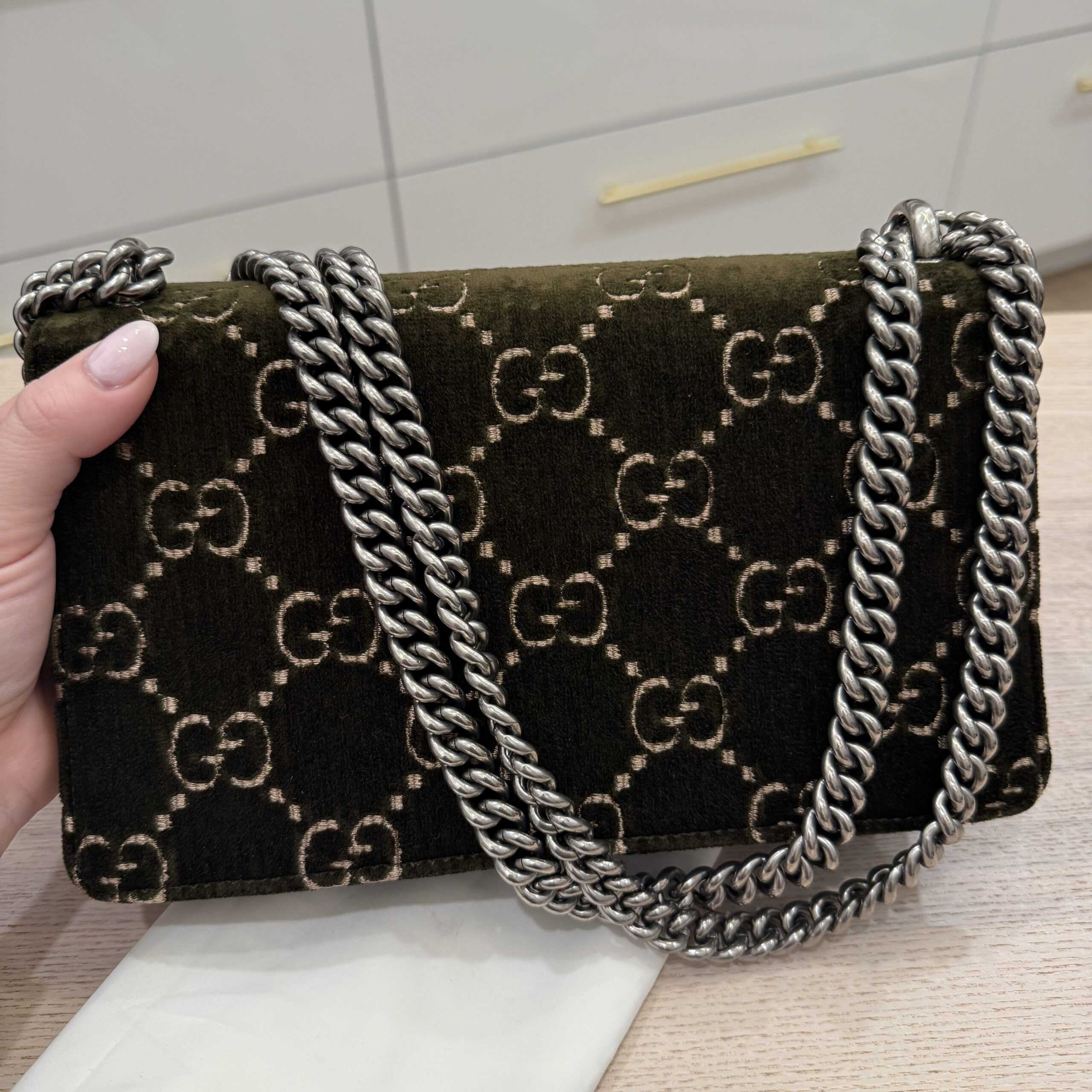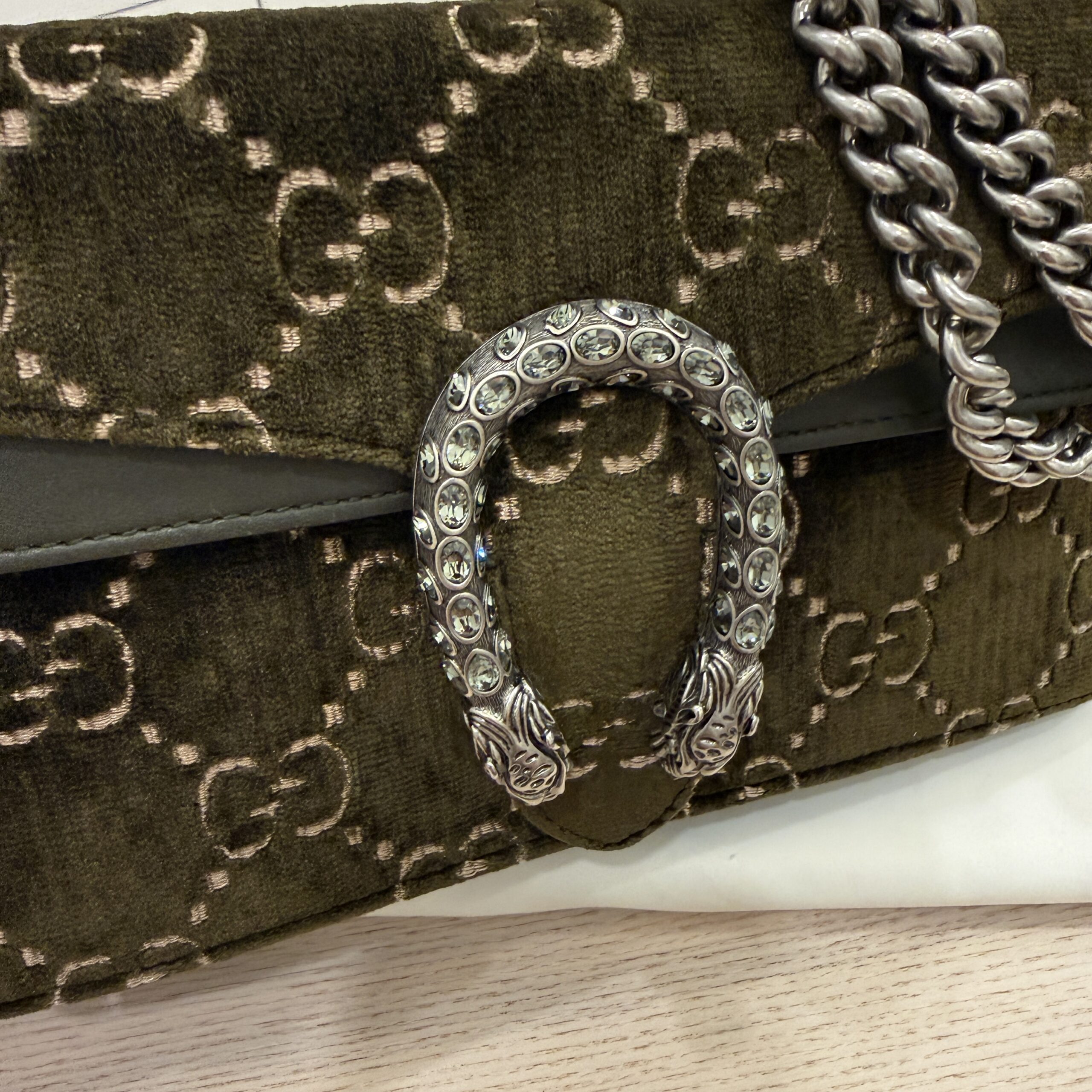 rdcdn Gucci Velvet Moon Calfskin Crystal GG Monogram Small Dionysus Shoulder Bag Dark Olive Rose Gold